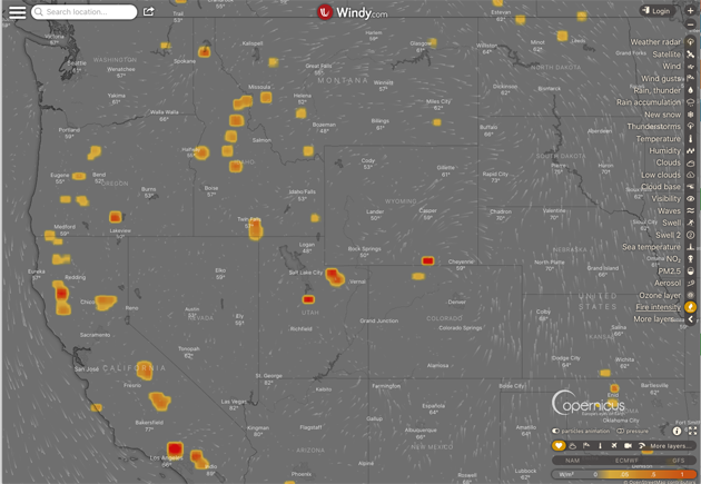 On the website Windy.com there are two useful maps related to fire. The first is the Fire Intensity Map which is derived from the thermal radiation measured from satellites, coming from actively burning vegetation. These are the current “hot spots”.