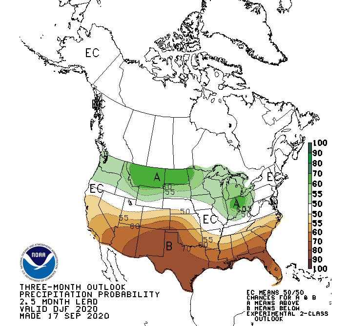 Montana looks to have the highest probability of SNOWIER than normal winter in 2020-21. The Pacific Northwest, is riding the 50 to 55-percent probability line for above normal precip. For the rest of the Southwest, it looks drier. Utah and Colorado are on the line of Equal Chances or land somewhere near the 50 to 55-percent probability of seeing below normal precip this winter.