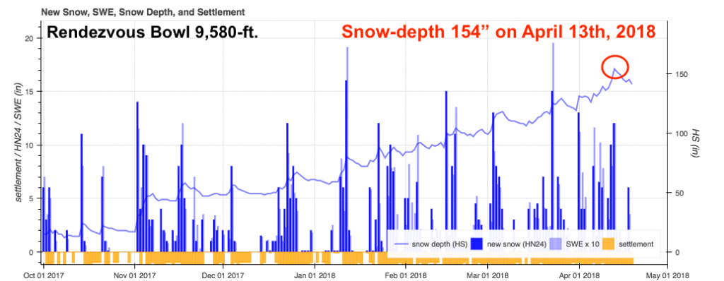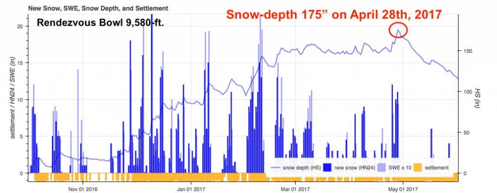Last year, the maximum snow-depth occurred on April 28th, 2017, with a record depth of 175 inches in Rendezvous Bowl. The deepest ever recorded at this location.