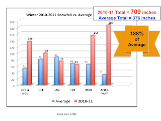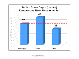 Pre-season snowfall, October & November 2011, was actually still a little above average in Jackson Hole, but nowhere near the amounts seen pre-season in 2010. (See graph below left).