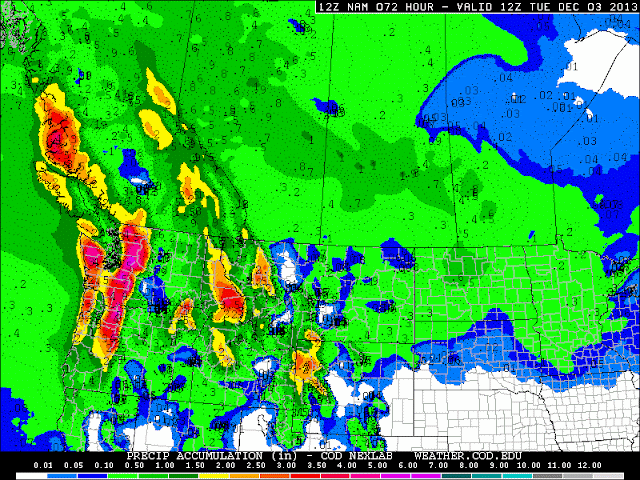 Low pressure center developing over British Columbia on Sunday, December 1st, will favor the Washington Cascades and northern Idaho & Montana initially. But some snow will fall in the mountains of SW Montana and western Wyoming.
