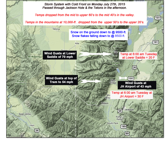 An unusually cold Low pressure system for late July moved across the Northern Rockies on Monday, July 27th, 2015 , bringing with it a dramatic drop in temperatures, and snow to the higher elevations of the Teton Range in western Wyoming, as well as some strong, gusty winds.