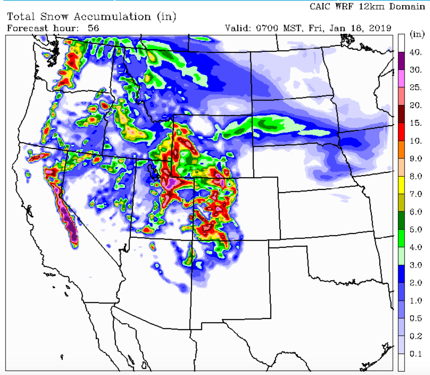 Another snowfall forecast model below, from the CAIC in Colorado shows a similar picture, for roughly the same time period, Wednesday to Friday morning. This one might haveĀ a little more in certain places than than the NAM.