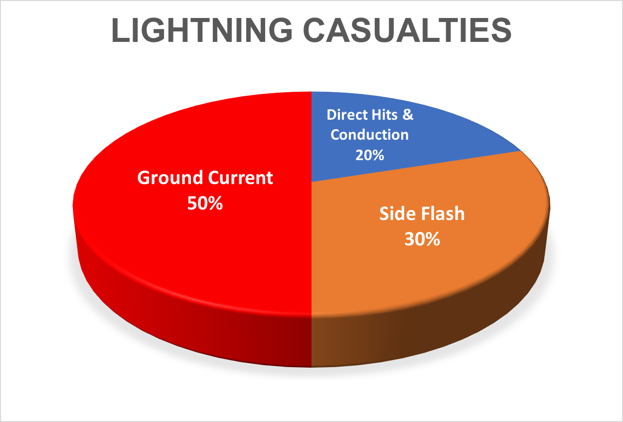 Direct hits and conduction account for about 20-percent of all lightning casualties. Side-flash accounts for about 30-percent. Ground currents are the most common way people are injured or killed by lightning, accounting for 50-percent of the casualties.