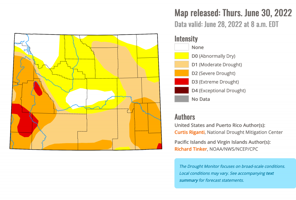 The map is updated every Thursday, identifying areas of drought and rating the intensity of drought on a scale of D0 to D4. On the lowest end of the scale, D0 indicates abnormally dry conditions. D1 is Moderate drought, D2 is Severe, D3 is Extreme, and D4 is Exceptional drought. Earlier in June, Teton County was in the D2-D3 category. Wyoming as a state rarely ever experiences D4 conditions, or exceptional drought.