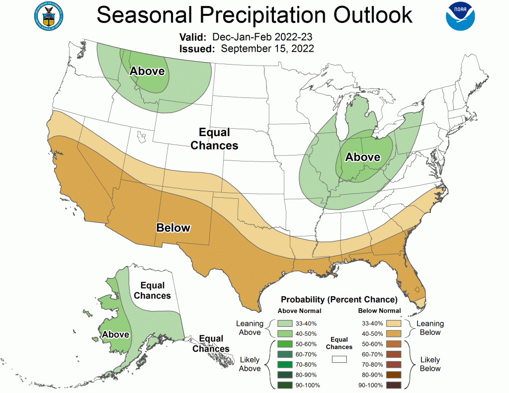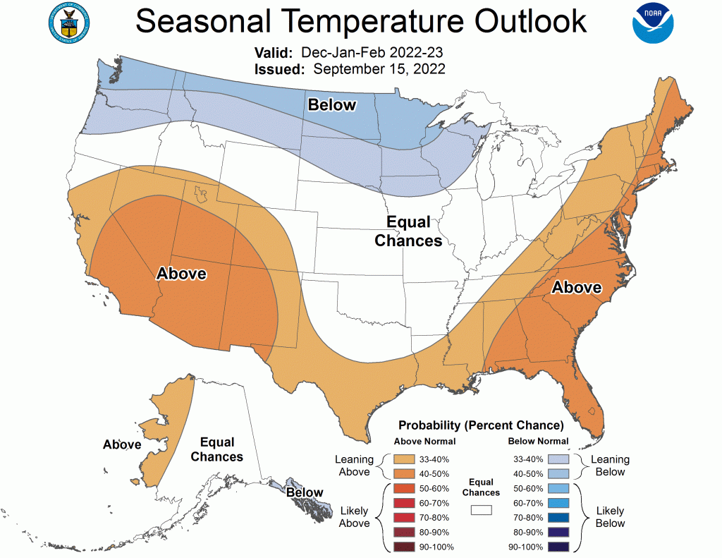 The latest forecast maps from NOAA’s Climate Prediction Center, issued in mid-September, are not showing anything out of the ordinary over this part of Wyoming. For December, January and February, they are predicting colder than normal temperatures to the north of us, from Washington State to Minnesota, and warmer than normal temperatures over the Southwestern United States. Wyoming sits in-between and essentially ends up with a 50/50 chance of being above or below normal for temperatures this winter.