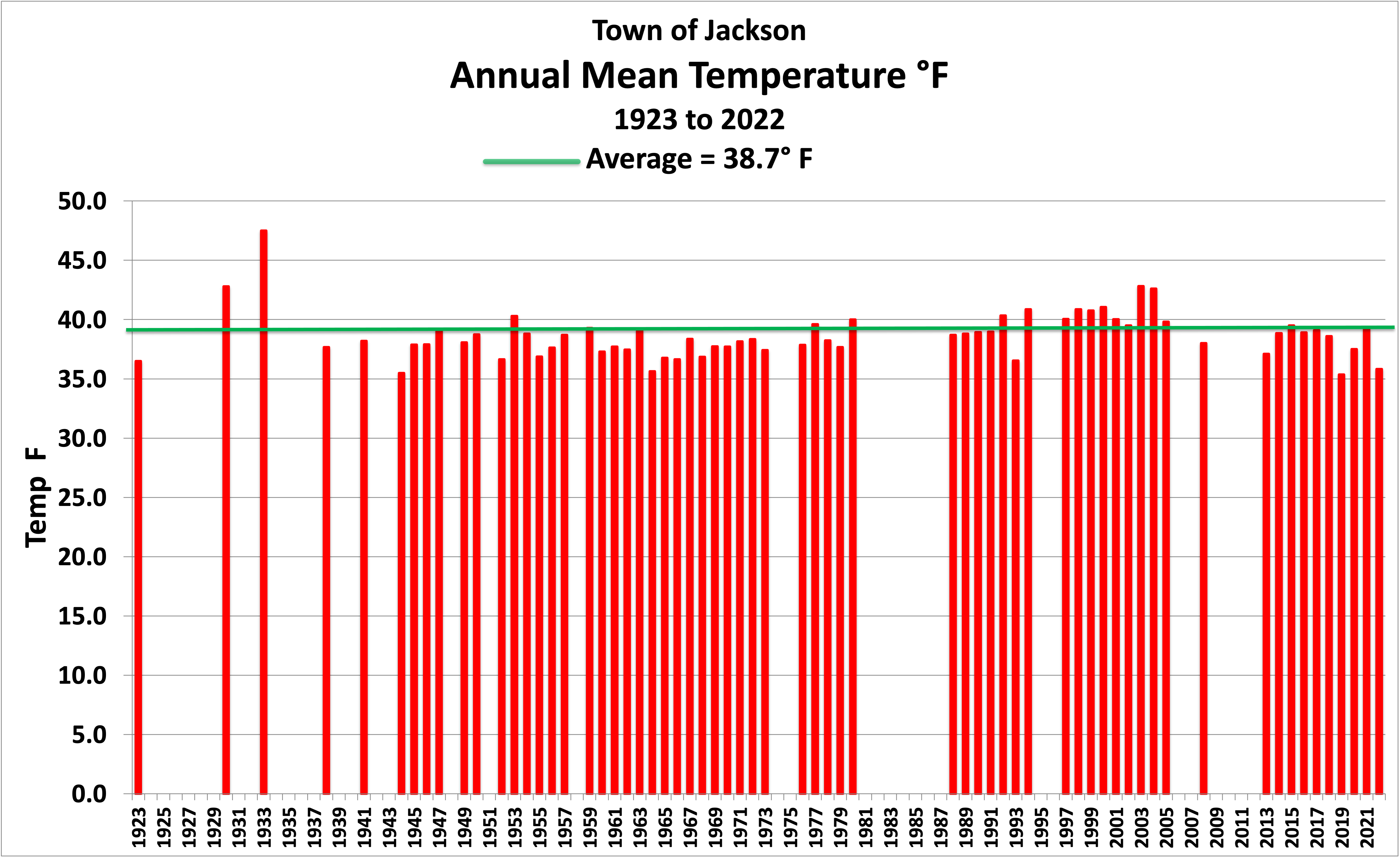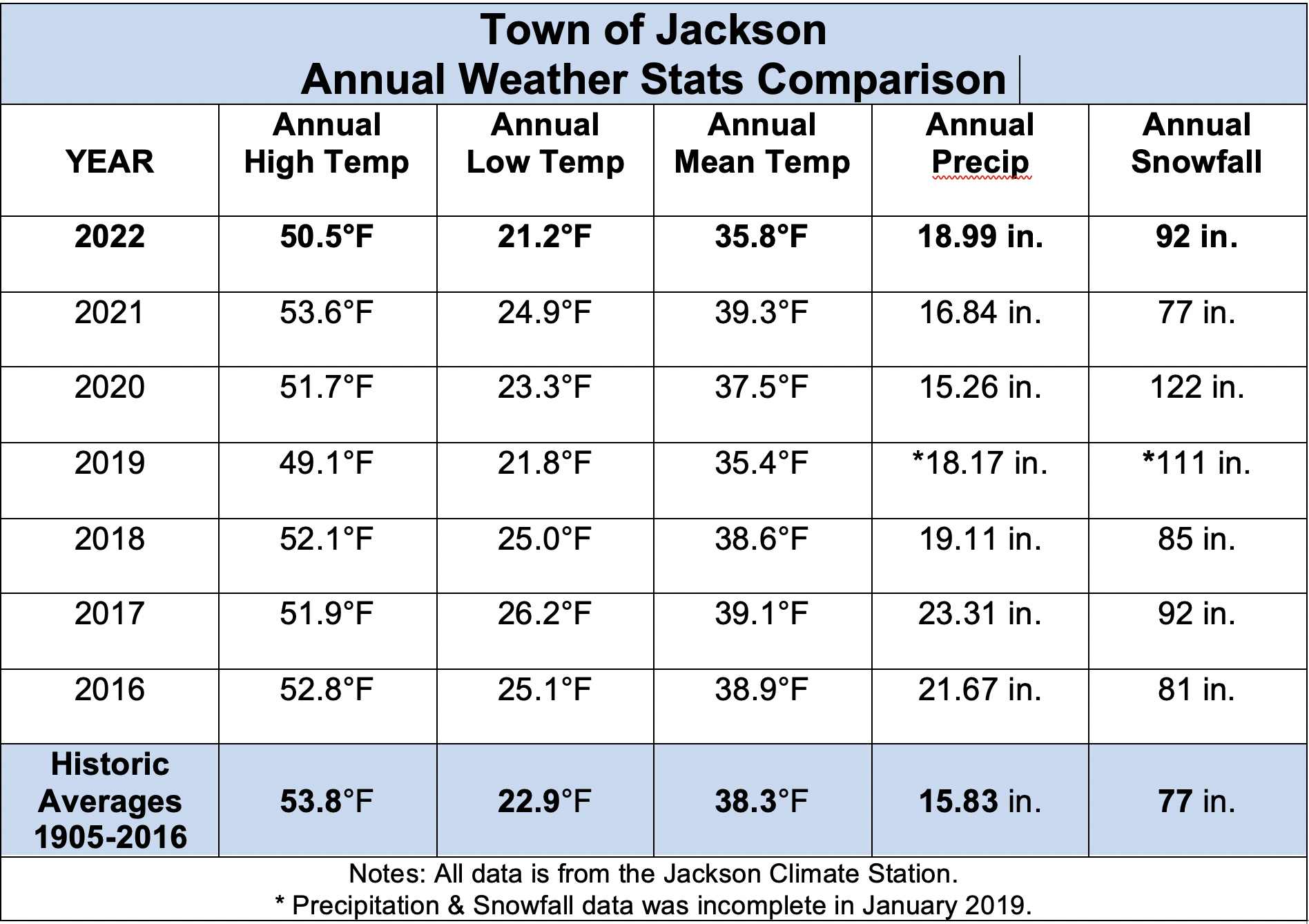 The annual mean temperature for 2022, the average of the annual high and low temperatures, checked in at 35.8 degrees. Jackson’s long-term average annual mean temperature is 38.3 degrees. That is 3.5 degrees colder than normal, making 2022 the fourth coldest year on record for the Town of Jackson.