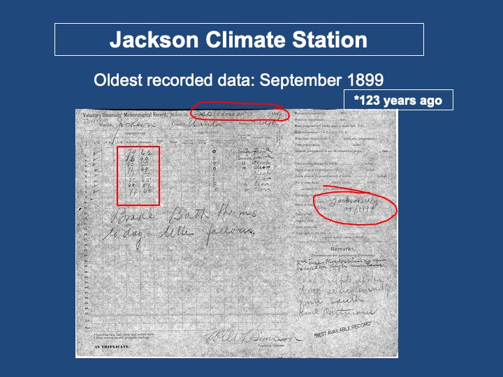 This presentation explores Jackson Hole’s weather history, beginning with when the earliest weather observations began, to where our local climate stations are located. It will also discuss how those observations are recorded and what has changed over the years, both in instrumentation and station location.