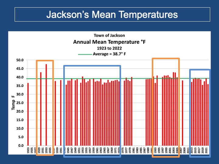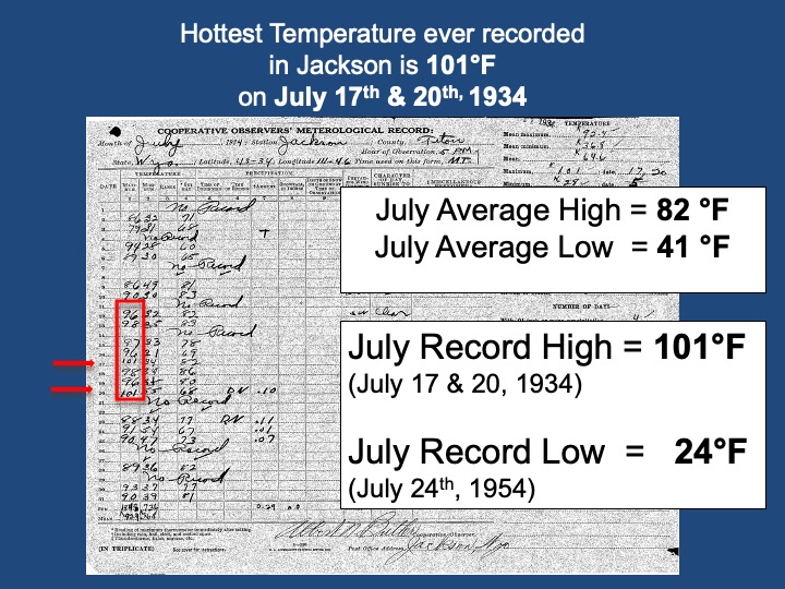 A complete picture of Jackson’s entire weather history is presented along with the current trends in temperature, precipitation, and snowfall. So, if you lived in Jackson Hole for a lifetime or just a few years, this presentation should provide you with a more comprehensive perspective on both the weather and climate of this unique location.