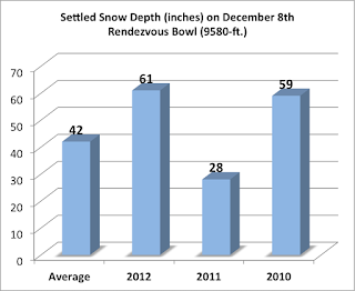 Below is the Updated graph of settled snow depths at Rendezvous Bowl as of Saturday morning December 8th 2012. Compared to average and year’s past.