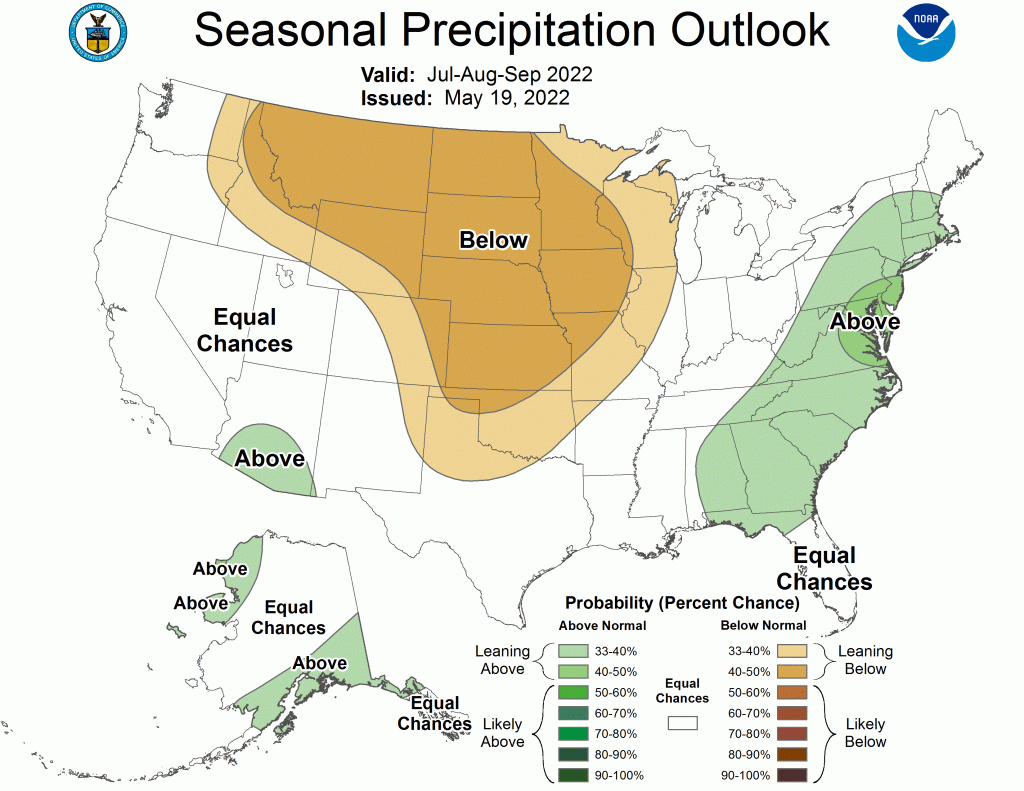 Precipitation-wise, the outlook is for below normal rainfall for June through August 2022, across the far northern Rockies and into the Plains States. In Jackson, the probability of it being drier than normal is somewhere around 40 percent, that is to say, the outlook is leaning towards a drier summer.