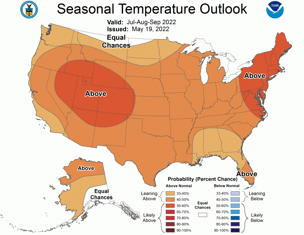 This summer’s temperature outlook has most of the United States in the warmer than normal category. Jackson Hole falls under a 50 to 60 percent probability of temperatures being above normal, overall, for June, July and August 2022. Which means it is slightly more likely than not that we’ll end up warmer than a normal summer.