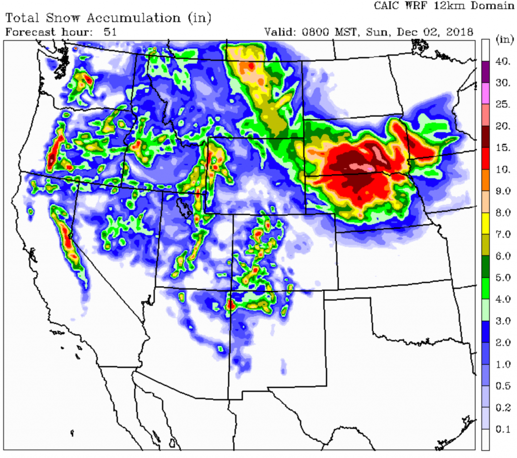 Biggest accumulations over the southern Cascades around Crater Lake, and also Southwestern Colorado’s mountains around Telluride and Wolf Creek Pass.