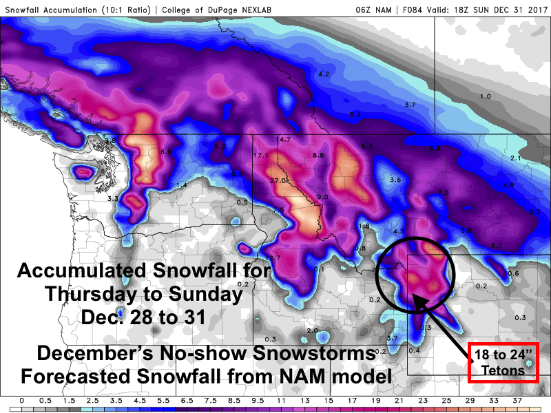 The computer models had anywhere from 18 to 30 inches of snow forecasted for the same time period in the Tetons.
