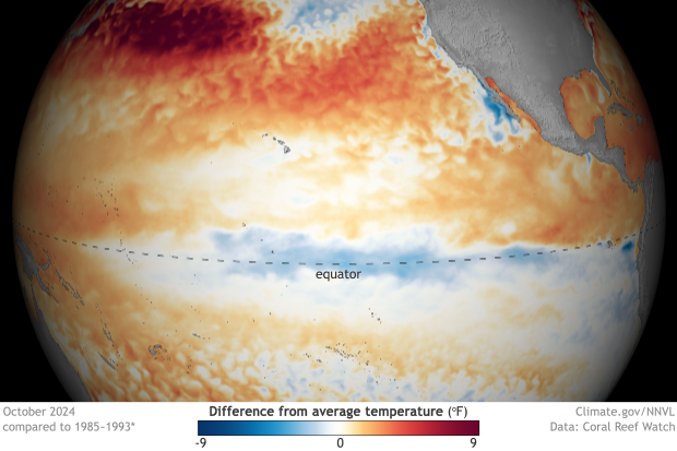 El Nino is one phase of ENSO, the El Nino Southern Oscillation. An El Nino condition is when sea surface temperatures in the Equatorial Pacific are warmer than normal. A La Nina occurs when those temperatures are colder than normal. Both El Nino and La Nina have some effect on the weather patterns that develop across the Pacific Ocean, primarily during the Northern Hemisphere’s winter season.