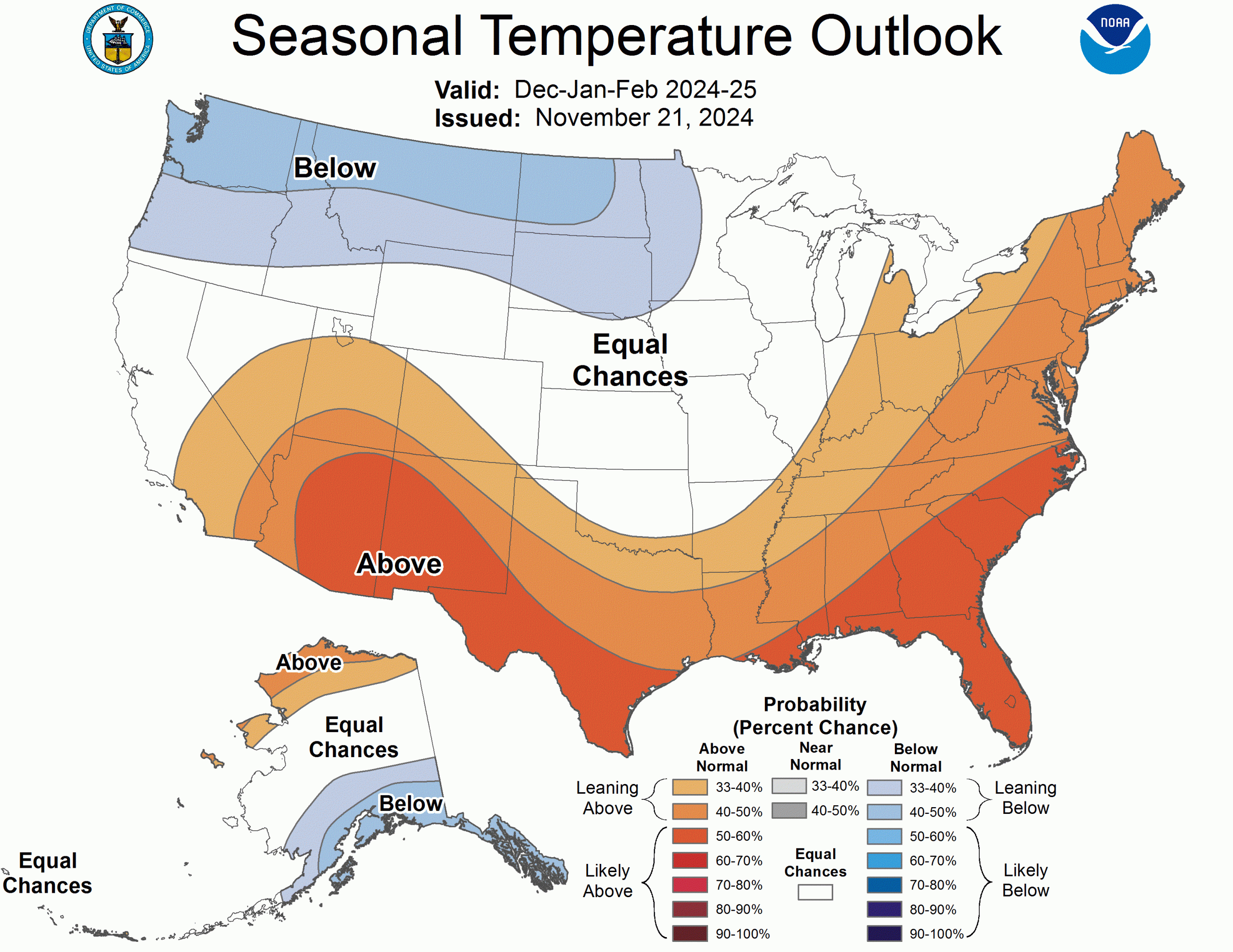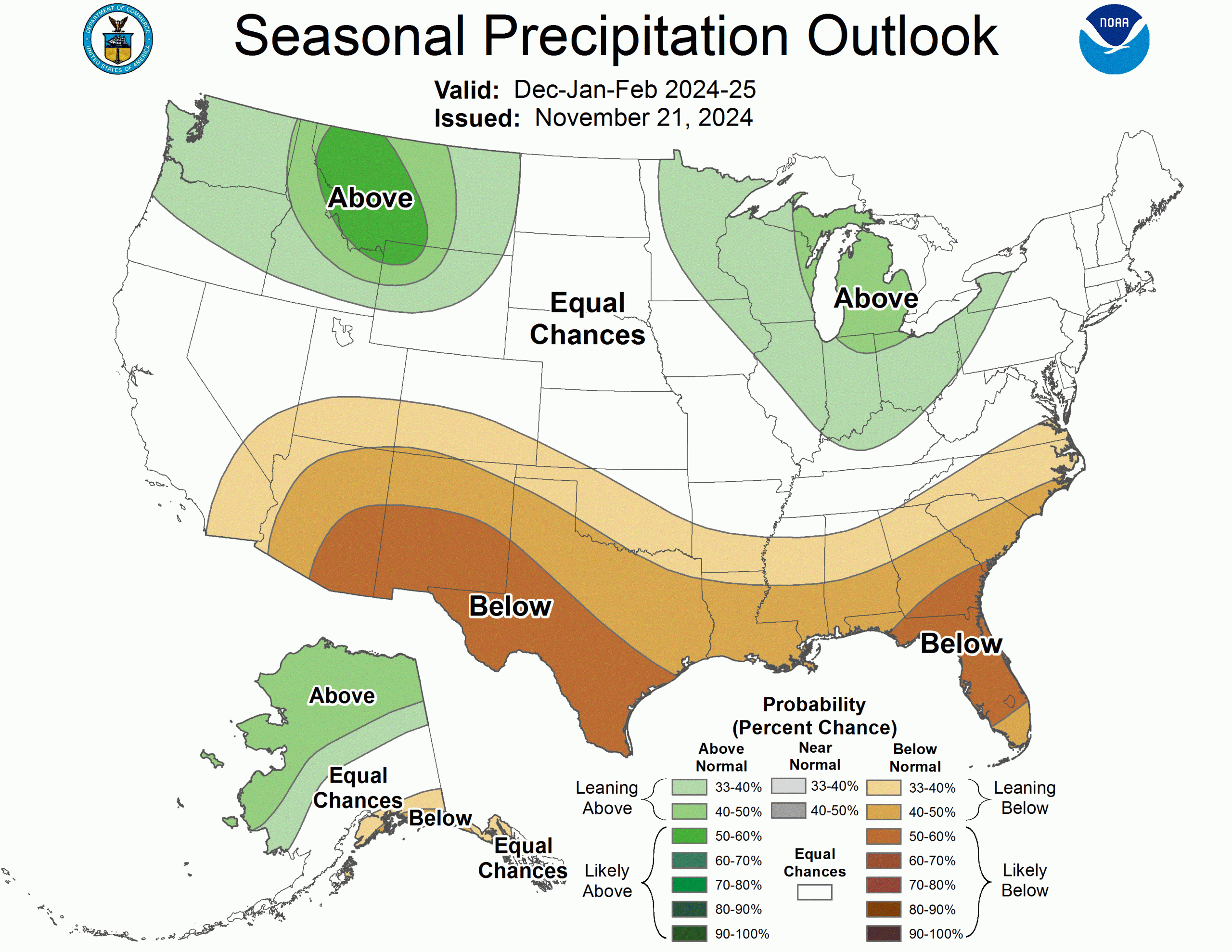 It’s Thanksgiving week and time to update the winter outlook for the coming months, as snow enthusiasts anticipate the powder yet to come. I’ll start with the latest outlook from NOAA for December through January, issued on November 21st, 2024.