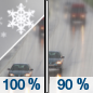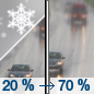 Snow likely. Mostly cloudy, with a low around 23. Breezy, with a southwest wind around 15 mph, with gusts as high as 23 mph. Chance of precipitation is 70%.