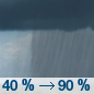 A chance of showers between noon and 3pm, then a chance of showers and thunderstorms after 3pm. Partly sunny, with a high near 67. East northeast wind 7 to 10 mph becoming south southwest in the afternoon. Chance of precipitation is 30%.